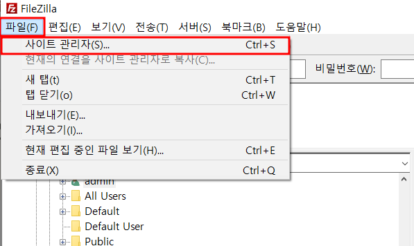 서버 연결이니, 당연히 서버 탭에 있겠거니... 했지만 초기 설정은 [파일 - 사이트 관리자]에서 하셔야 합니다.