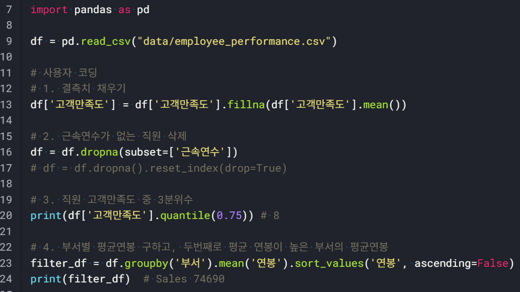 데이터는 회사 직원 연봉과 근속 연수 등에 대한 자료가 나왔습니다. 결측치 대체 및 제거 과정을 거치고, 4분위수와 그룹 통계를 구하는 문제였어요.
