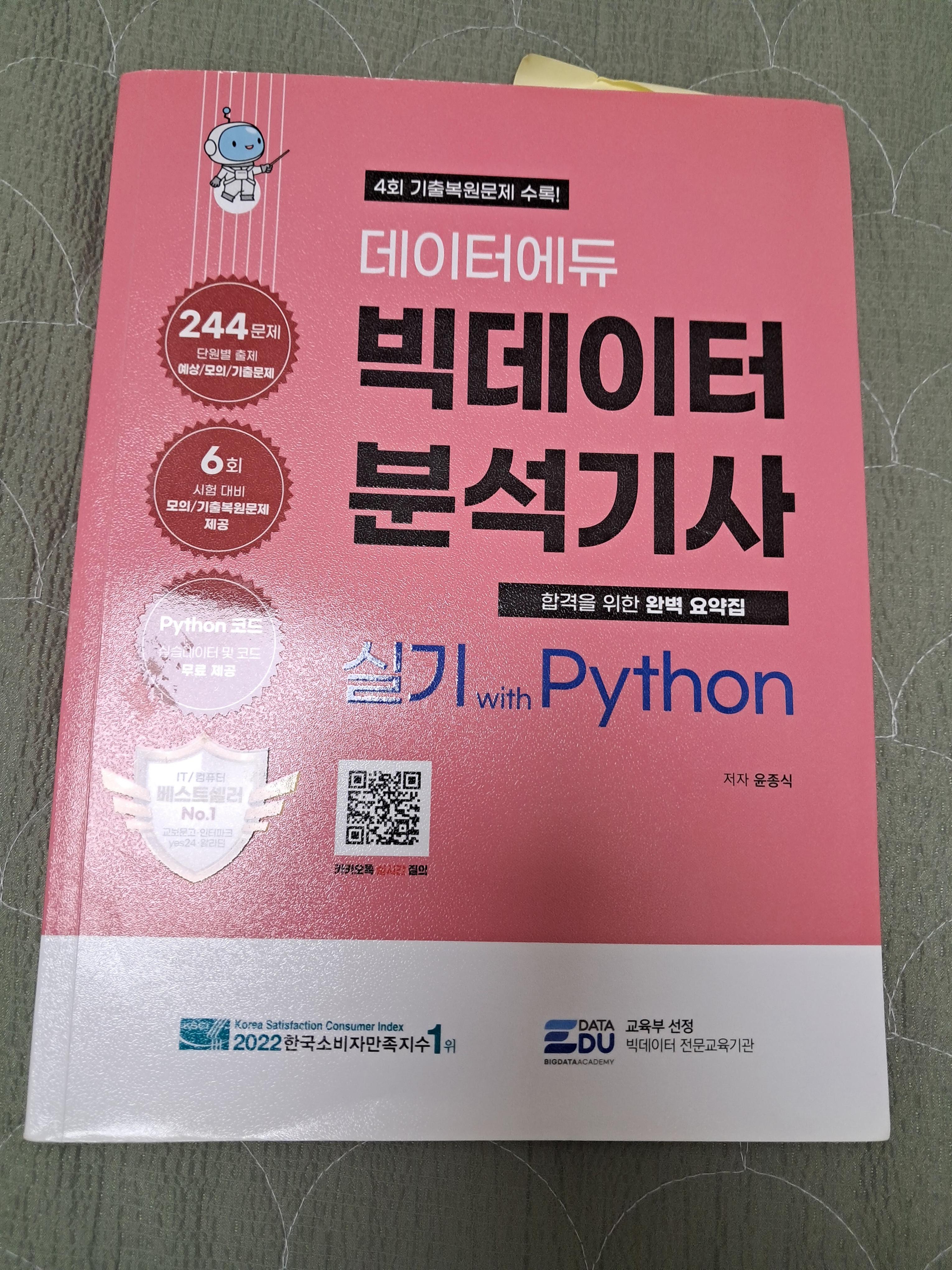 그래서 코딩을 못하시면 난이도가 매우 높은 시험입니다. 파이썬 또는 R언어를 능숙하게 다루실 수 있어야 합격할 수 있습니다. 저는 파이썬으로 응시했고, 위 실기책으로 공부했습니다.
