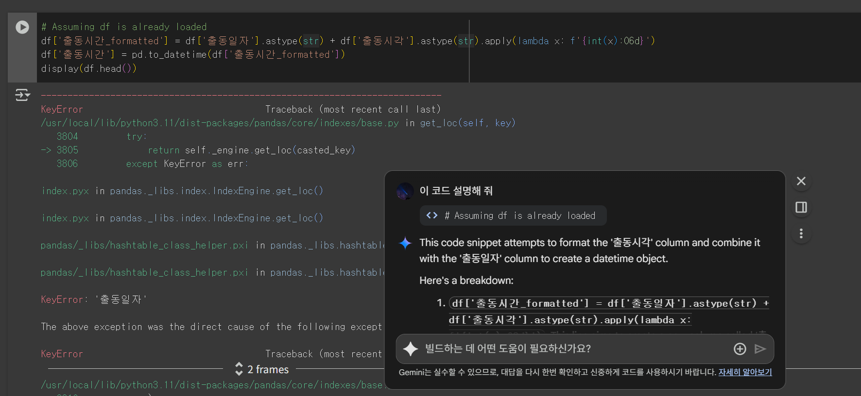데이터 분석 분야는 코랩 혹은 주피터 노트북을 많이 사용합니다. 인터프리터 환경이 확실히 바로바로 결과를 볼 수 있어서 좋아요. 저는 그 중에서 코랩을 사용했습니다. 코랩의 좋은 점은 'Gemini'를 쓸 수 있다는 점입니다. (무료도 제공)