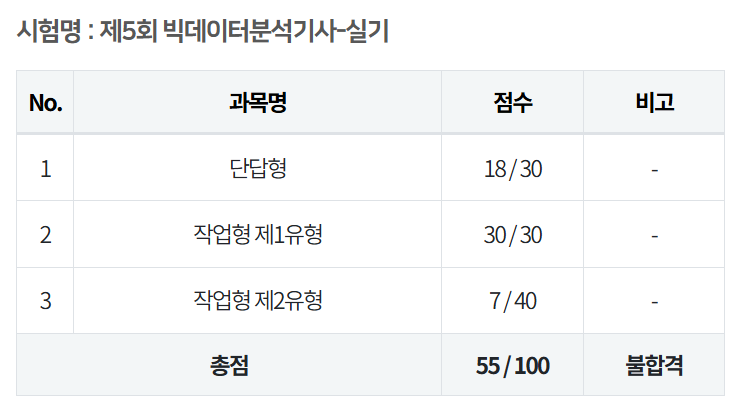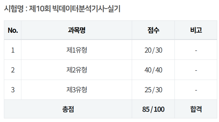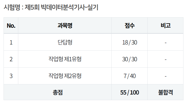 거져준다는 제2유형에서 점수를 얻지 못해서 불합격했습니다. 확실히 빅데이터 분석기사는 최신 학문을 다루기 때문에.. 어려워지기 전에 취득하는 게 좋습니다. 계속해서 어려워지고 있어요.