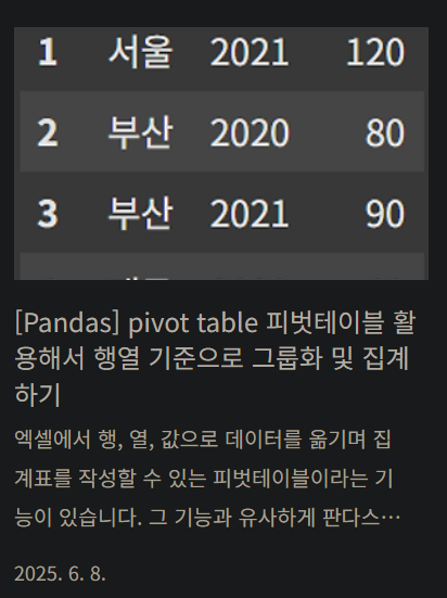 2025.06.08 - [Data Visualization/Python Lib] - [Pandas] pivot table 피벗테이블 활용해서 행열 기준으로 그룹화 및 집계하기