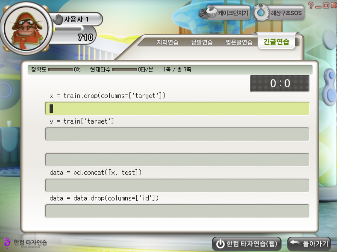 그리고 형식화된 만능 코드를 한컴타자연습으로 반복하면서 외웠습니다. 어느 데이터가 주어지든 결측치만 처리하면, 뒤에는 똑같습니다.