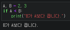 조건문에는 비교 및 논리연산자로 구성된 식이 들어갑니다. 위 조건문은 2 < 3 이므로 True이며 실행됩니다.