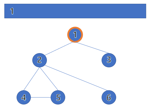 위에서 봤던 예제를 다시 살펴보겠습니다. 시작 노드는 1번이며, 큐에 삽입하고 방문(탐색) 합니다. 방문한 노드는 주황색 테두리로 표시하겠습니다.
