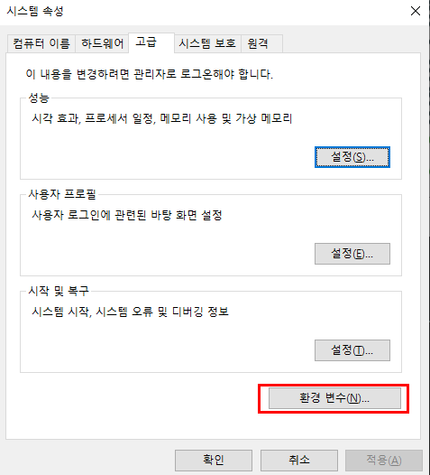 탐색창에 '시스템 환경변수'를 검색하고, [시스템 환경 변수 편집]을 실행해주세요.
