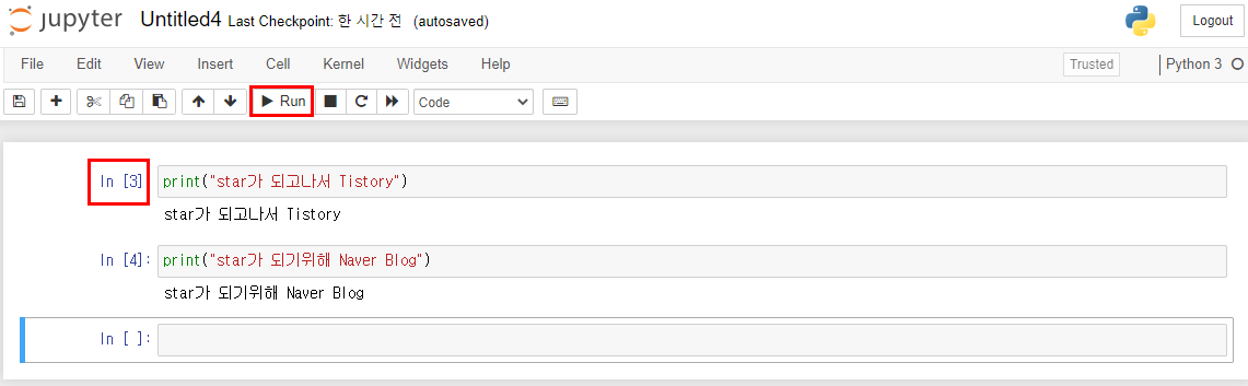 Cell을 선택하고 Run키를 누르면 실행이 됩니다. 셀 왼쪽에 나오는 숫자는 '실행 번호'입니다. In [3]은 3번째 실행임을 의미합니다. 출력값인 output도 out [N] 과 같이 셀 밑에 표시됩니다.