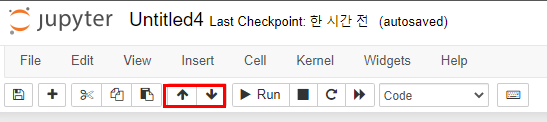 커널을 재시작하는 버튼입니다. 우측 상단에 보시면, 작동중인 커널이 있습니다. '커널'을 통해 프로그램을 실행하며, 간혹 커널이 멈추거나 오작동하는 경우가 있습니다. 이럴 때 Restart the Kernel 버튼으로 재시작합니다.