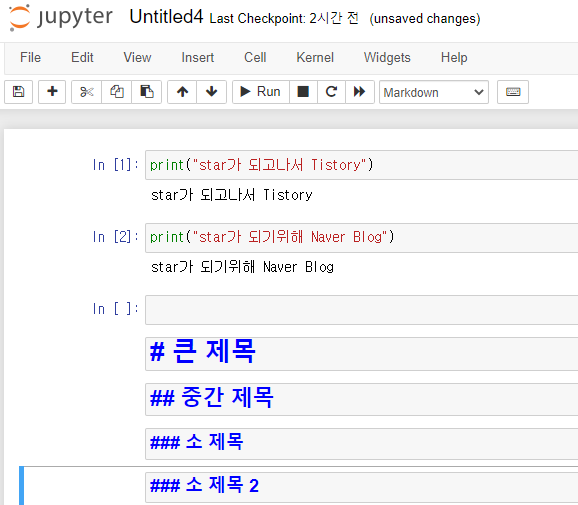 주피터노트북에서는 주석 역할을 'MarkDown'이 합니다. 깃허브를 쓰시는 분들이라면, ReadMe.md 파일을 생각하시면 될 것 같습니다. 주석 위치에 Code 대신 MarkDown을 선택하면, 마크다운 형식으로 셀이 변환됩니다.