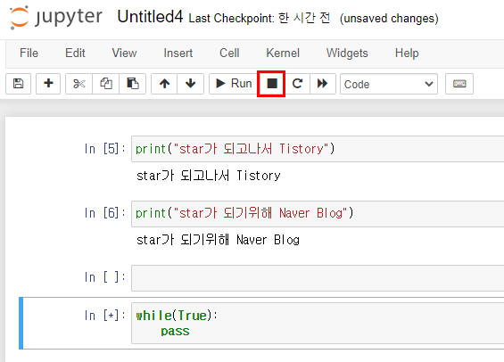 실행 중인 셀을 중지하면, KeyboardInterrupt 예외처리가 되면서 끝이 납니다.