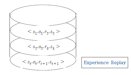 따라서, 시간축에 따른 correlation을 줄이고자 Experience Replay에 transition 정보를 저장하고 랜덤으로 샘플링해서 학습에 사용합니다. Experience Replay는 Queue 자료구조와 유사하며, 버퍼가 가득차면 오래된 에피소드 정보를 지우고 최근의 에피소드 정보로 최신화합니다.