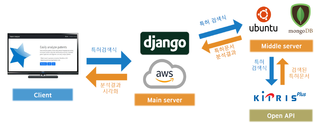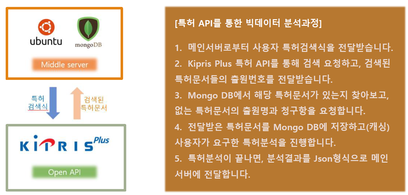 사용자가 입력한 특허검색식에 대한 검색 결과를 받기 위해서 특허 API를 사용합니다. 미들 서버에서는 검색된 특허문서를 토대로 빅데이터 분석을 진행하고 결과를 메인서버로 전달합니다.