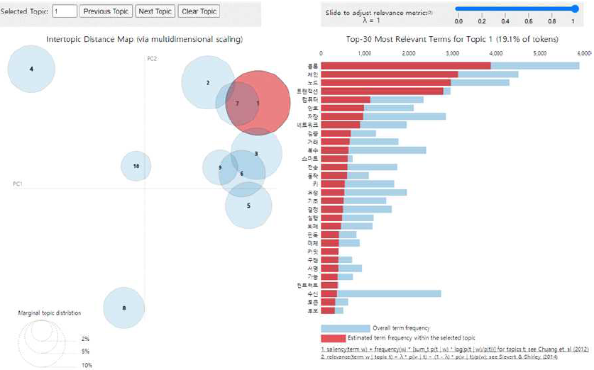 오른쪽 막대그래프는 각 토픽 별로 주요 단어들을 출현 빈도가 높은 순서대로 보여주고 있습니다. relevance metric λ는 1이며, 해당 파라미터를 조정하여 토픽과 단어 간의 연관성 측정방식을 섬세히 조작할 수 있습니다.