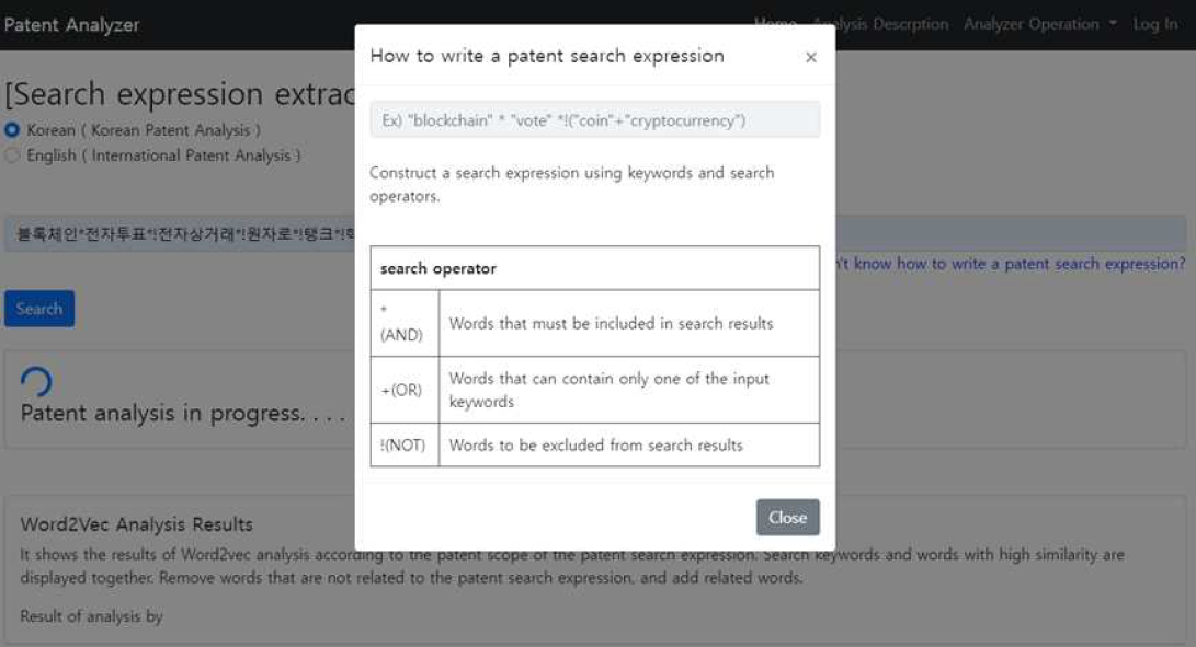 특허검색식이 서툰 사용자를 위해 Modal형식으로 검색식 작성 도움말을 제공했습니다.