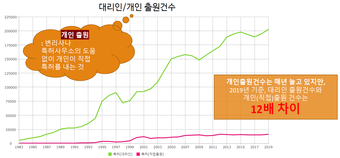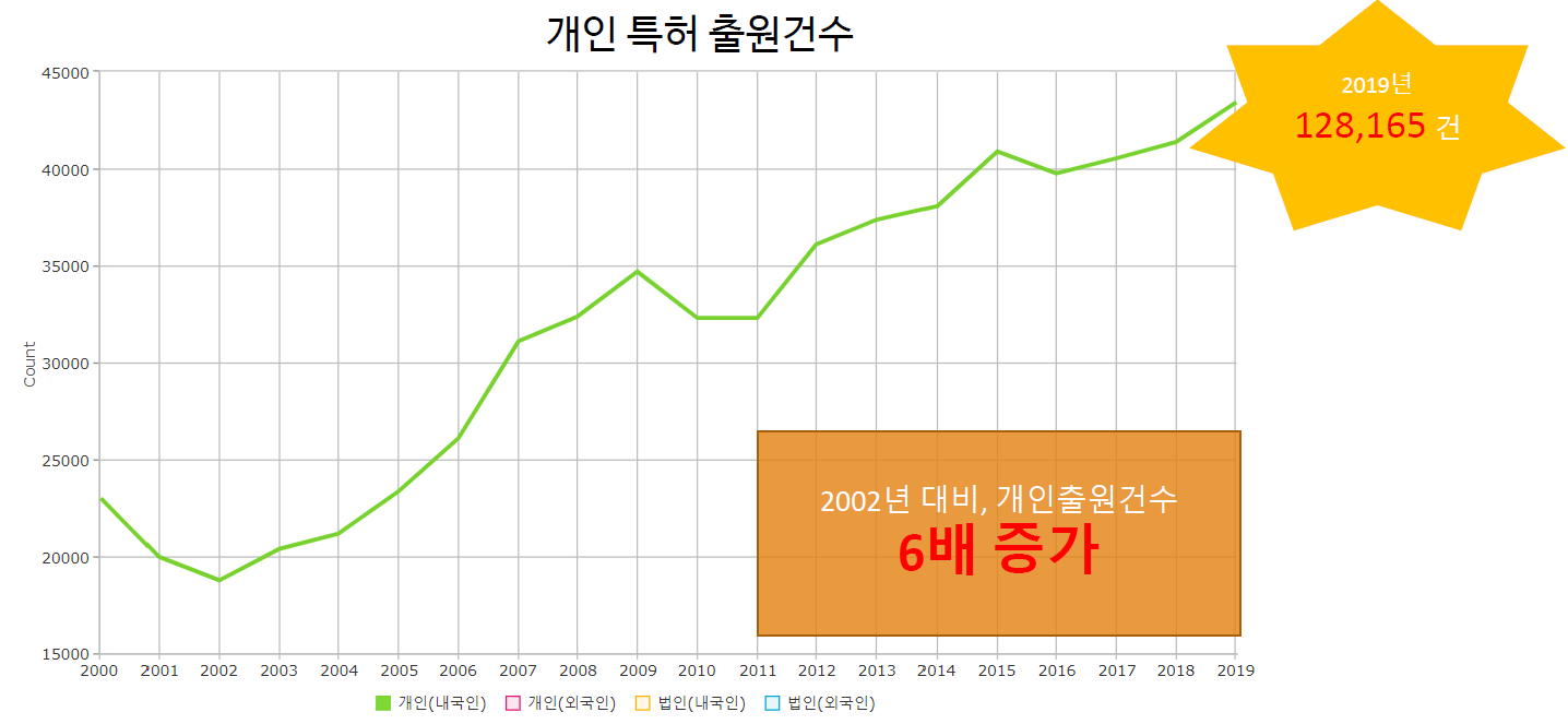 이에 해마다 특허출원건수가 증가하고 있으며, 개인의 특허출원건수도 크게 늘고 있습니다. 대한민국은 GDP-인구 대비 특허출원율 1위이며, 개인출원건수도 2002년 대비 6배나 증가했습니다.