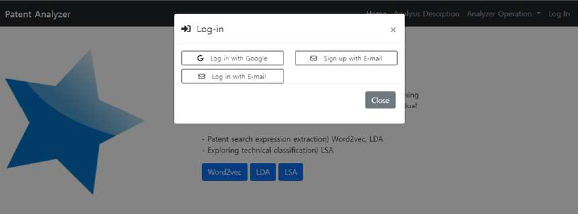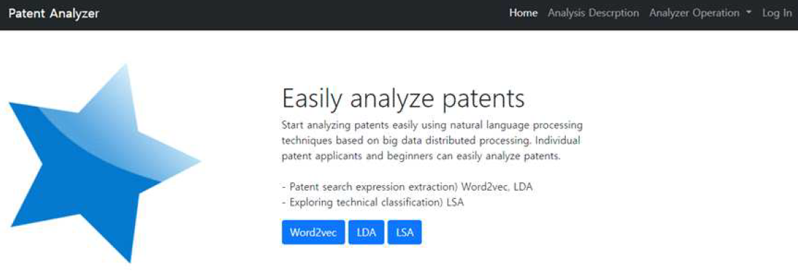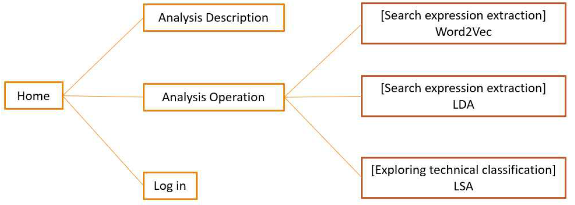 Analysis Operation은 실제로 사용자에게 서비스를 제공하는 페이지입니다. 각 기능별로 별개의 페이지로 구분되어있습니다. 각 페이지에서는 유효한 특허 검색식 추출해주는 기능인 Word2Vec과 LDA 서비스를 제공하고, 특허 범위 내 핵심 기술분류를 추출해주는 LSA 서비스를 제공합니다.