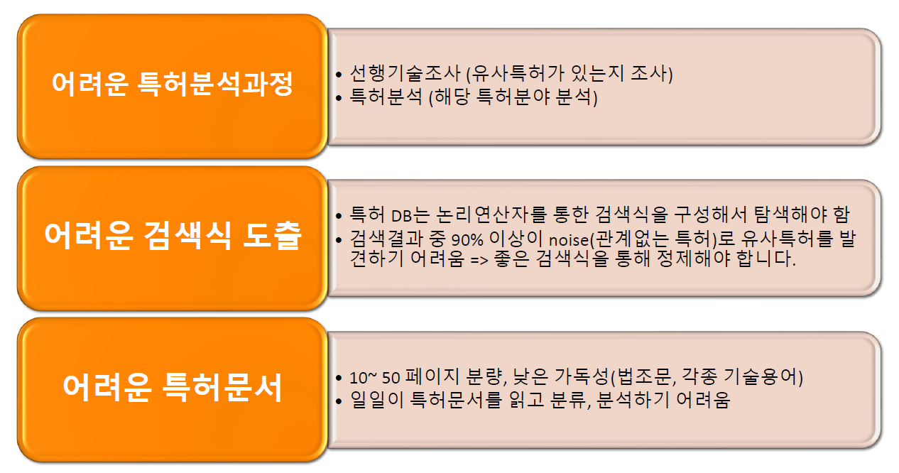 - 대부분의 개인 출원자는 '유사 특허'로 등록을 거부 당함. 이는 개인이 특허분석을 통해 유사 특허를 발견하지 못했기 때문에 발생 ( 특허조사에 필요한 전문성, 시간, 노동력 모두 부족 )