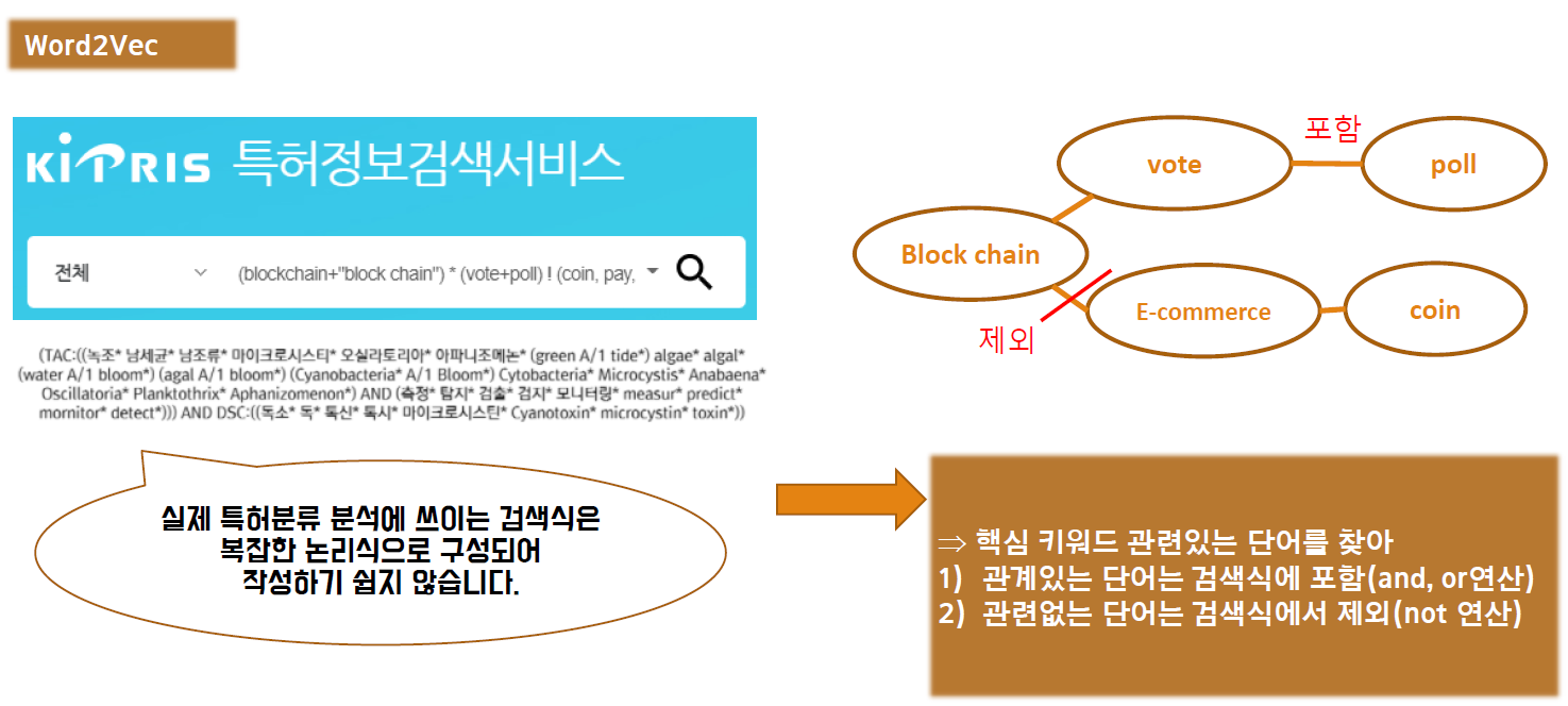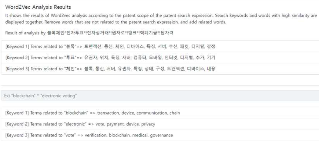 예를 들어, ‘블록체인-전자투표’ 특허 범위에서 키워드인 ‘블록체인’을 Word2Vec 분석하여 유사도가 높은 단어를 추출합니다. 이렇게 추출된 단어는 ‘코인’, ‘네트워크’, ‘암호’ 등 해당 특허의 기술분야나 응용분야를 암시하는 단어일 가능성이 높습니다. 이렇게 검색된 단어 중에서 블록체인 및 전자투표와 관계없는 단어는 검색식에서 제거하고, 관계있는 단어는 추가함으로써 유효한 검색식을 추론할 수 있습니다.