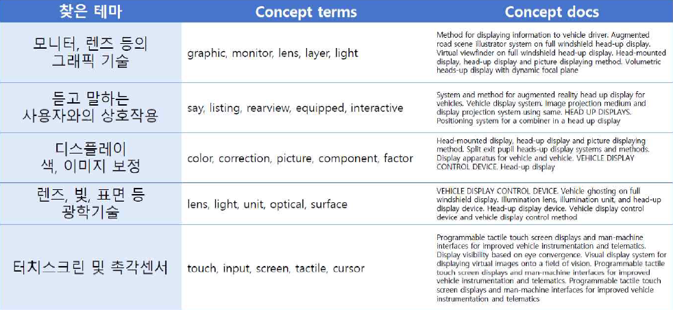 LSA 기법을 통해서 뽑아낸 핵심 테마와 그에 관련된 기술 키워드를 조합하여, 기술분류표를 추출할 수 있습니다. 기술분류표는 해당 특허 범위 내에 어떤 기술 분류가 있는지 알려주며, 해당 특허 범위를 이해하는 중요한 지표입니다.