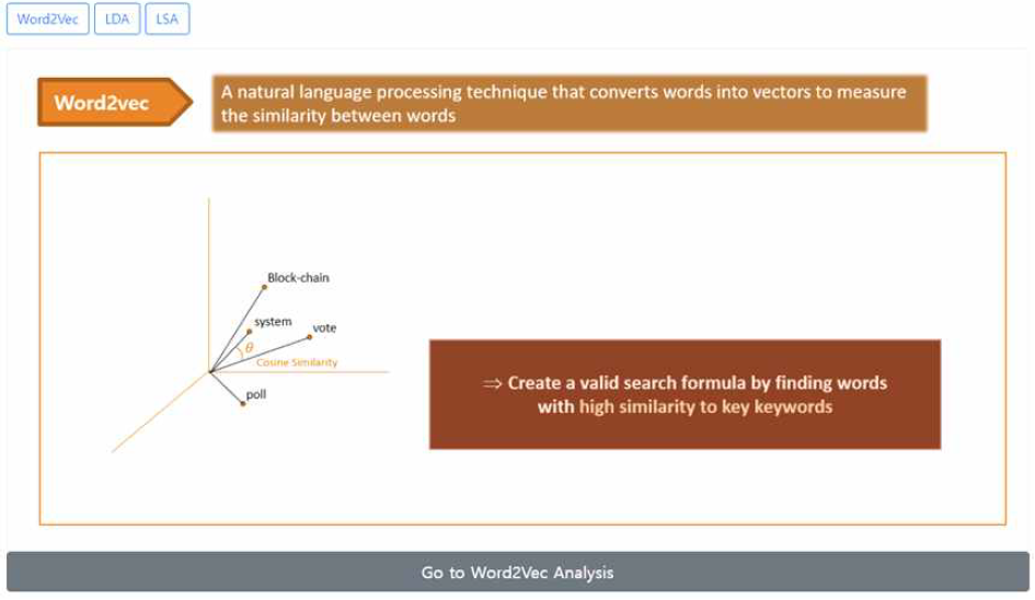 Analysis Description은 사이트에서 제공하는 특허 빅데이터 분석 서비스인 Word2Vec, LDA, 그리고 LSA의 자세한 기능 설명을 다루고 있습니다.