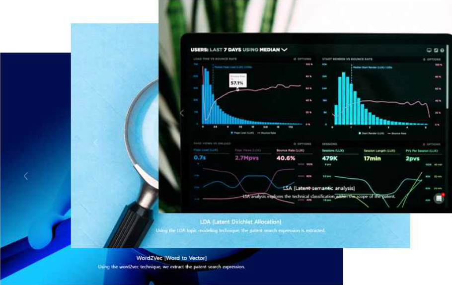 [ Patent Analyzer ]에서는 주요 3가지 분석 서비스 (Word2Vec, LDA, LSA분석)을 제공하며, 이를 통해서 유효한 검색식 추출 및 기술분류 분석을 할 수 있습니다. 위 자료는 이에 대한 간략한 인터랙션 과정을 설명하고 있습니다.