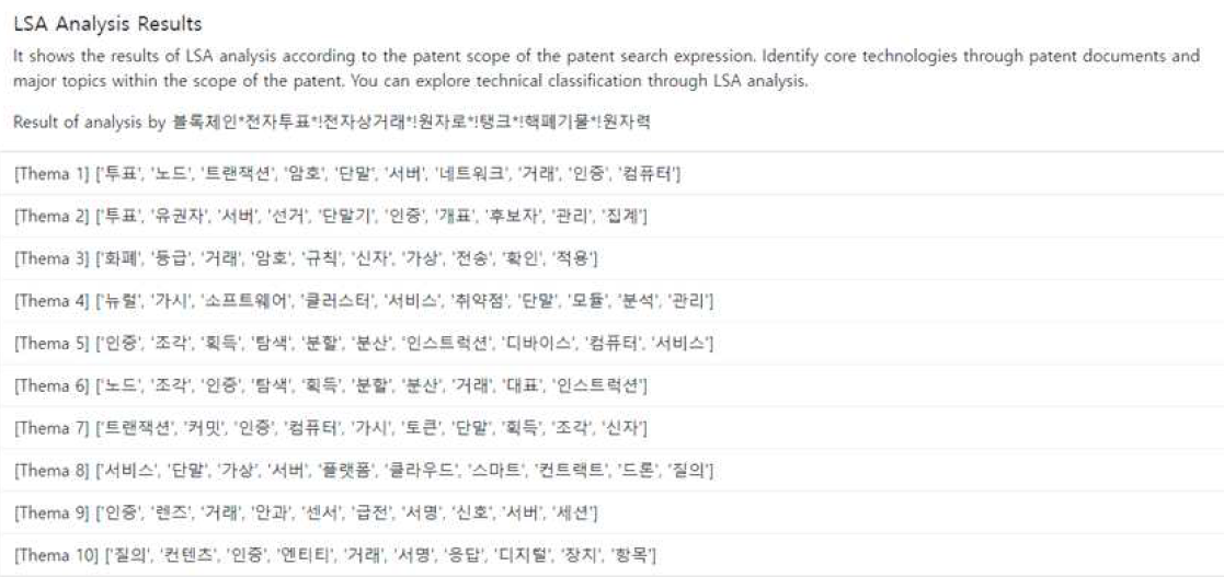 사용자가 입력한 특허범위 내 특허문서를 LSA 분석한 결과를 출력합니다. 상위 10개의 테마와 관련 있는 키워드를 함께 출력했습니다. 사용자는 출력된 키워드들을 통해 핵심 기술을 추론하고 기술분류표를 예상해볼 수 있습니다.