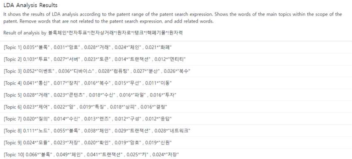 사용자가 입력한 특허 범위 내 특허문서를 LDA 토픽모델링한 결과를 출력합니다. 상위 10개의 토픽과 관련 있는 키워드와 중요도를 함께 출력했습니다. 사용자는 출력된 키워드들을 통해 초기 검색식을 보완할 수 있습니다.