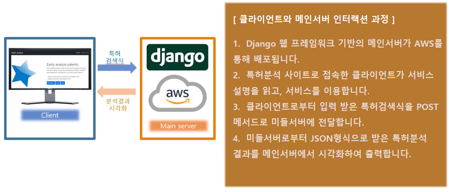 Django 웹 프레임워크 기반의 메인서버는 AWS를 통해서 배포됩니다. 사용자는 배포된 서버를 통해서 특허분석 서비스를 이용할 수 있습니다. 메인서버에서는 사용자가 쉽게 이용할 수 있도록 각종 매뉴얼과 상세한 기능 설명을 제공하며, 특허 분석이 익숙하지 않은 초보자들도 이해하실 수 있습니다.