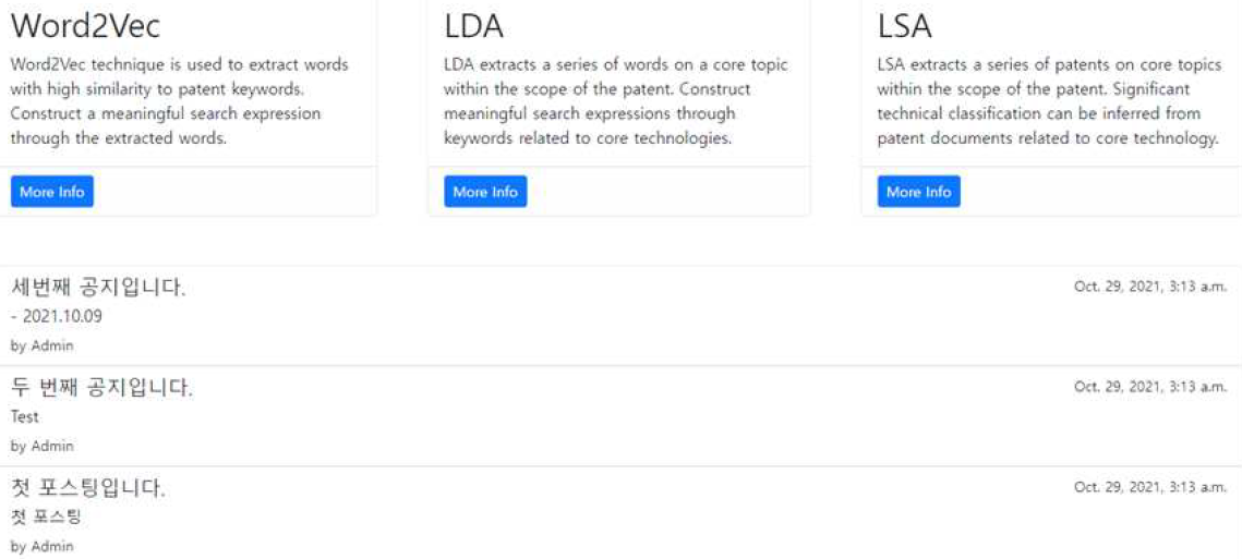 Home 하단부에는 주요 서비스인 Word2Vec, LDA, LSA기법을 설명한 카드슬롯과 함께 공지게시판을 배치했습니다. More info버튼을 누르면, 해당 기법의 상세 설명 페이지로 이동합니다.