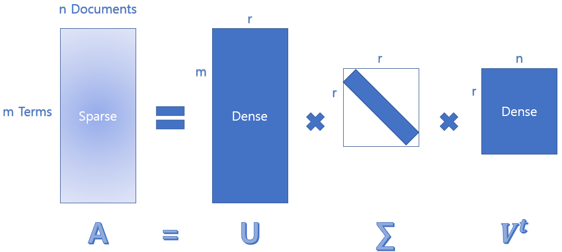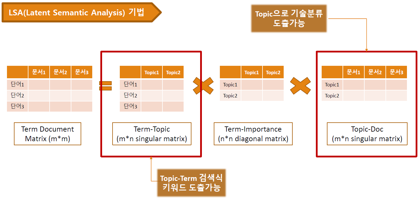 LSA(Latent Semantic Analysis)는 truncated SVD(Singular Value Decomposition) 분해를 통해서 단어, 문서, 토픽 간의 스페이스를 구축하고 차원 축소를 통해 유의미한 정보를 이끌어낼 수 있습니다.