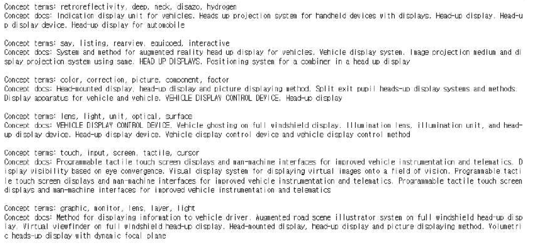 이러한 LSA의 특성을 이용하면, Term-Topic space로부터 검색식 키워드도 찾을 수 있으며, Topic-Doc space로부터 기술분류도 탐색할 수 있습니다. 여기서 기술분류란, 특허 범위 내 핵심 기술분야들을 분류한 표를 말하며, 출원자가 해당 특허 범위를 이해하는 데에 중요한 지표가 되는 자료입니다.