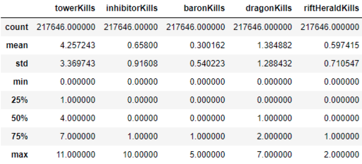 LoL 게임 데이터의 feature는 위와 같습니다. 승패에 영향을 줄 수 있는 항목들로, 각 feature의 관계와 승률에 미치는 영향성을 알아보기 위해 정량분석을 진행했습니다.