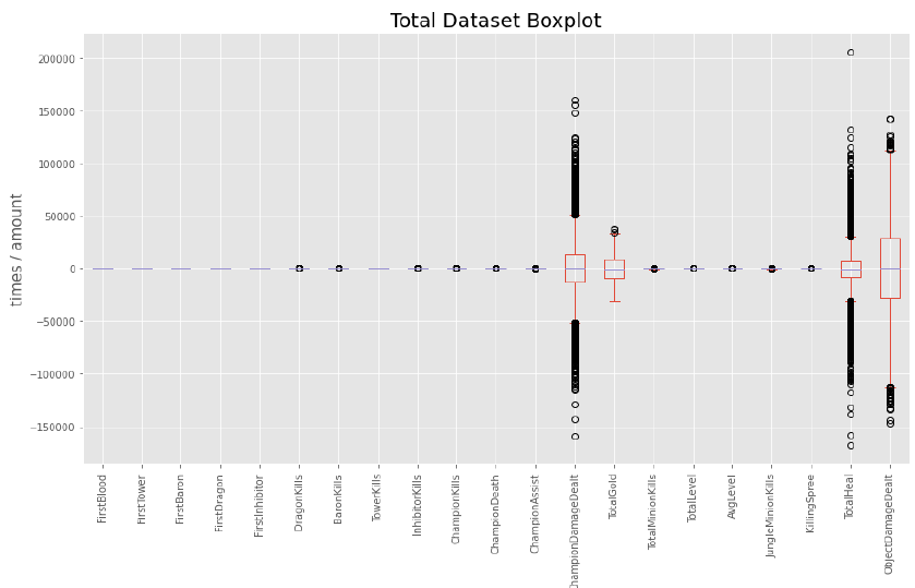 Total Dataset의 Boxplot입니다. box plot을 보면 ‘ChampionDamageDealt’, ‘TotalHeal’, ‘ObjectDamageDealt’의 이상치가 상당히 많음을 알 수 있습니다. 따라서 해당 feature는 제외하는 걸 고려해볼 수 있습니다.