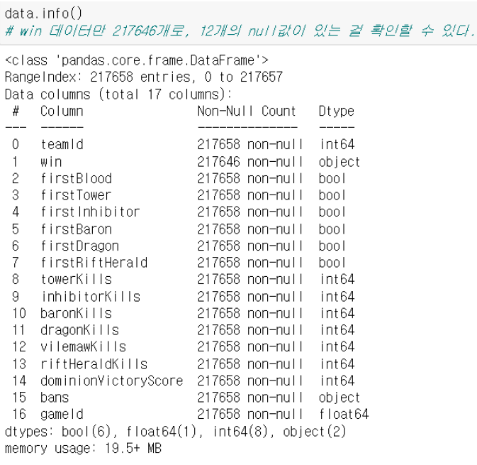 데이터셋은 총 17개의 columns과 217658개의 row로 이루어져 있습니다. win column을 보면 12개의 null이 있는 걸 확인할 수 있습니다. 비정상적으로 종료된 게임으로 예상되며 결측치를 제거합니다.
