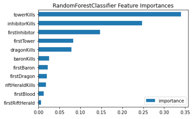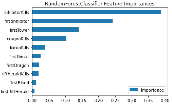 Random Forest classifier의 feature 중요도는 위와 같습니다. LoL은 상대방 기지를 파괴하는 공성게임 장르(MOBA, AOS)이므로 타워와 억제기 파괴 횟수가 승리에 큰 영향을 준다고 나왔습니다.