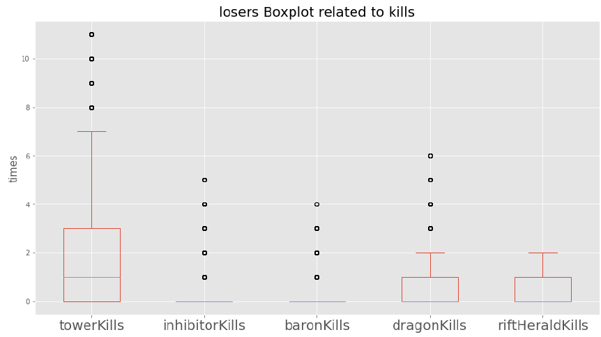Boxplot으로 살펴보면, 패배팀의 outlier가 돋보입니다. 전반적인 수치는 0에 가깝지만, 간혹 높은 경우가 있습니다. 이는 후반부까지 진행된 경기로 추측할 수 있고, 승리한 팀과 비슷하게 또는 약간 불리하게 게임을 진행하다 패배한 경우입니다. 이러한 경기들이 승률 예측하기 어려울 것으로 예상됩니다.