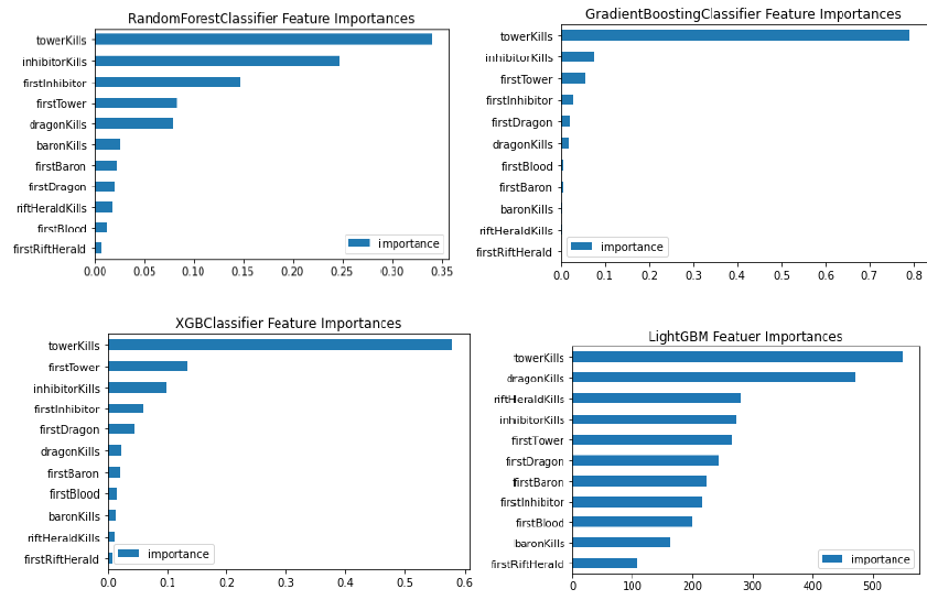 - 모든 모델에서 towerKills feature를 가장 중요한 feature로 뽑았으며, 해당 feature에 대한 의존도가 높음