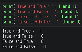 and 연산은 모두 True일 때만 True이고, or연산은 모두 False일 때만 False입니다.