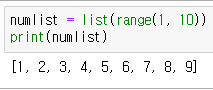 range 함수를 이용해서 특정 수열을 생성할 수 있습니다. 보통은 for문에서 많이 사용하나, 리스트 초기화에도 사용할 수 있습니다.