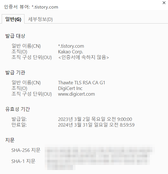 Tistory 사이트의 보안인증서 발급기관은 'DigiCert'군요. 보안인증서를 발급해주는 '인증기관'이 따로 있으며, 인증기관은 인증서를 발급하고 인증 서버를 통한 보안 연결을 제공합니다.