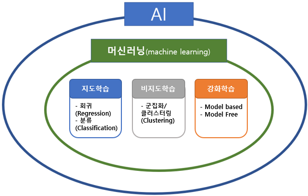 AI는 '여러 개의 선택지를 빠르게 탐색하고 비교해서 최적의 안을 내놓는 컴퓨터'라고 볼 수 있으며, 기계학습은 '컴퓨터가 인공지능을 얻기 위해 학습하는 알고리즘'입니다. 즉, 방법론입니다.